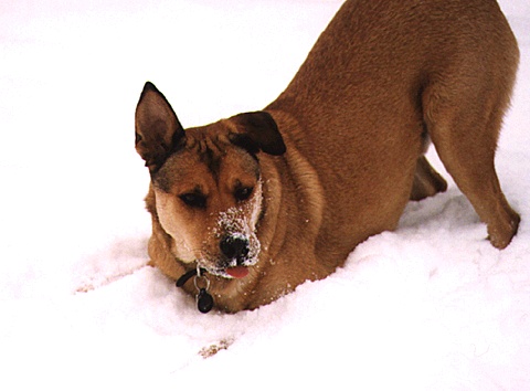 The dog was absolutely amazed by the snow, especially when he realized he could eat it...